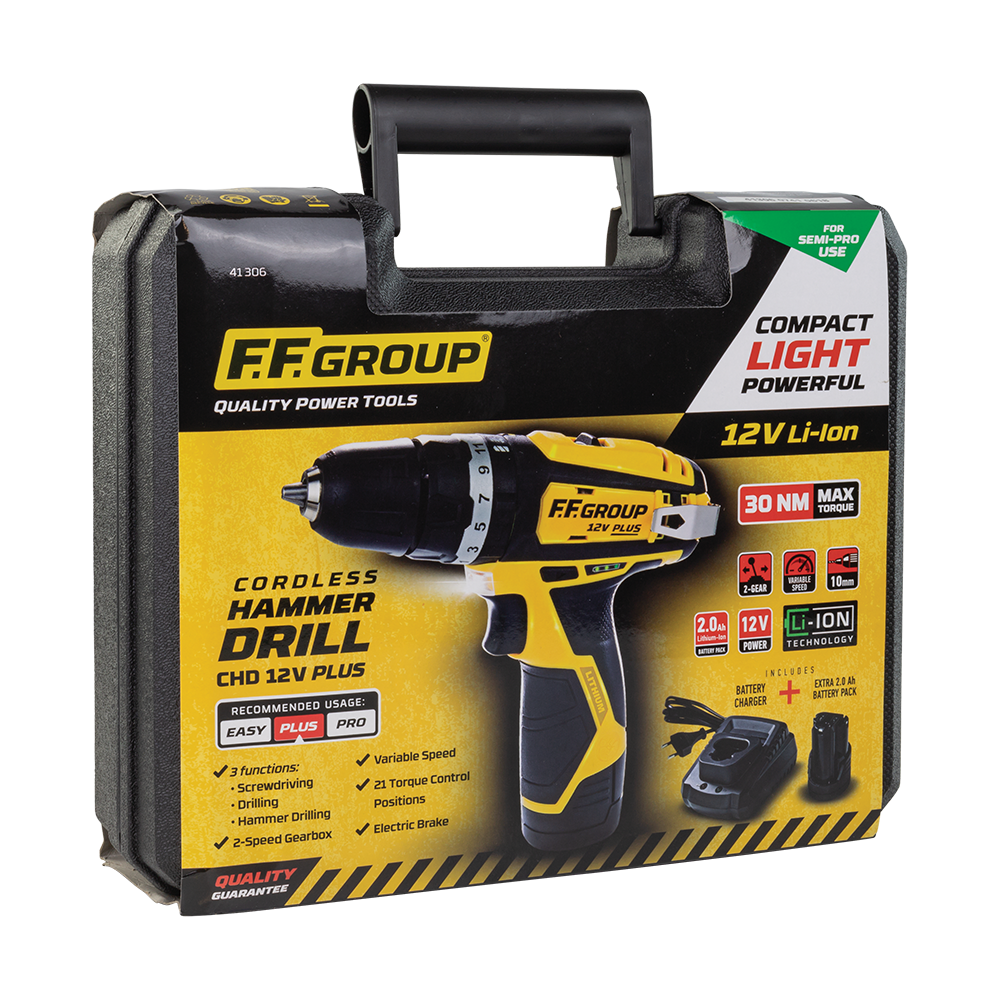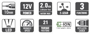 Κιβώτιο 2 ταχυτήτων Ροοστατικός διακόπτης 3 λειτουργίες: α. Βίδωμα β. Διάτρηση γ. Διάτρηση με κρούση 21 βαθμίδες ροπής στρέψης LED φως εργασίας